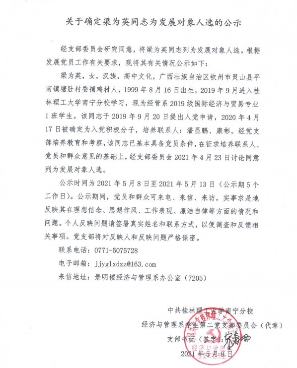 经济与管理系学生第二党支部关于确定梁为英同志为发展对象入选的公示