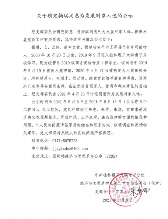 经济与管理系学生第二党支部关于确定揭琪同志为发展对象入选的公示