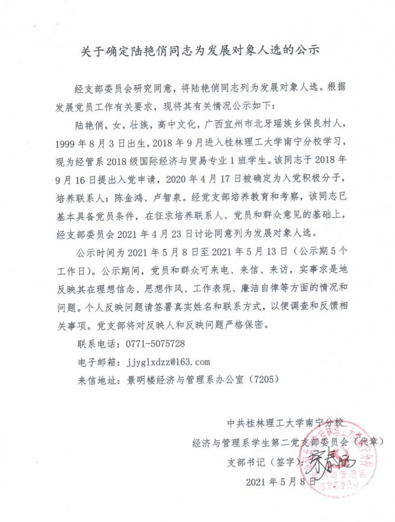 经济与管理系学生第二党支部关于确定陆艳俏同志为发展对象入选的公示