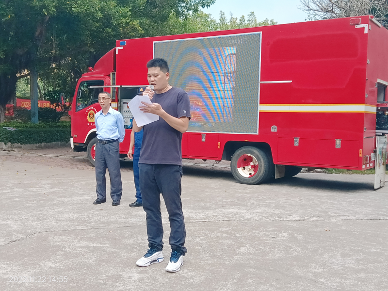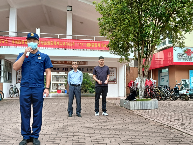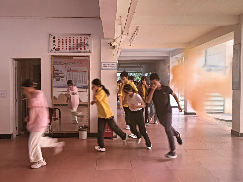 此次消防演习以模拟火灾疏散现场的方式进行开展,共分为六个环节。首先由现场指挥的杜建老师为学生做动员工作,强调在消防演习中的注意事项,并宣布演习开始;随后,保卫工作部在1号宿舍楼正、后门相关位置点火并放置烟雾弹,带班老师随即组织学生进行消防演习;当班班长听到紧急信号后,通知宿管值班人员和保卫工作部工作人员,立即组织宿舍学生进行疏散;在学生救援组老师和学生干部的指挥下,学生按照演练要求,弓腰俯身、掩捂口鼻,按指定线路紧张而有序地下楼,在指定安全区集合;消防演习期间,学校医疗组进入现场进行救援,对伤者的进行简单处理并带离现场;紧接着,各负责老师整理队伍,清点学生人数,确保2022级600余名学生全部安全疏散完毕。最后,由杜建老师对大家进行消防灭火评讲。