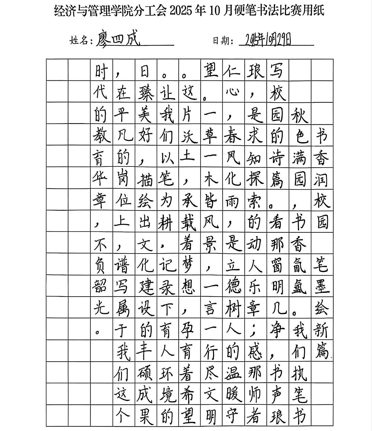 为丰富校园文化生活,激发教职工练字兴趣,增强文化自信,培养良好书写习惯,近日,经济与管理学院分工会开展“盛世金秋谱华章 奋进有为正当时”硬笔书法活动,全院教职工积极参与。
