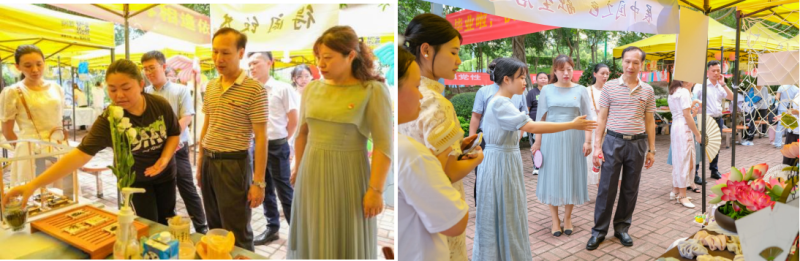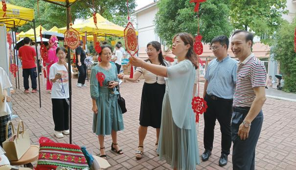 最后,受邀嘉宾和全体同学前往会场。展览会现场氛围活跃,同学们热情地介绍展位的文化主题、设计理念、展位搭建的模型以及精心制作销售的文化商品。老师们就文化活动设计和文创产品创意方面与同学们亲切交流并给予了建议。