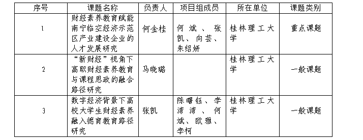 近日,广西教育教育科学规划领导小组办公室下发《广西教育科学规划领导小组关于组织开展广西教育科学“十四五”规划2022年度广西财经素养教育研究专项课题申报工作的通知》(桂教科学〔2022〕24号),经济与管理系组织申报的3个项目获广西教育科学“十四五”规划2022年度广西财经素养教育研究专项课题立项。