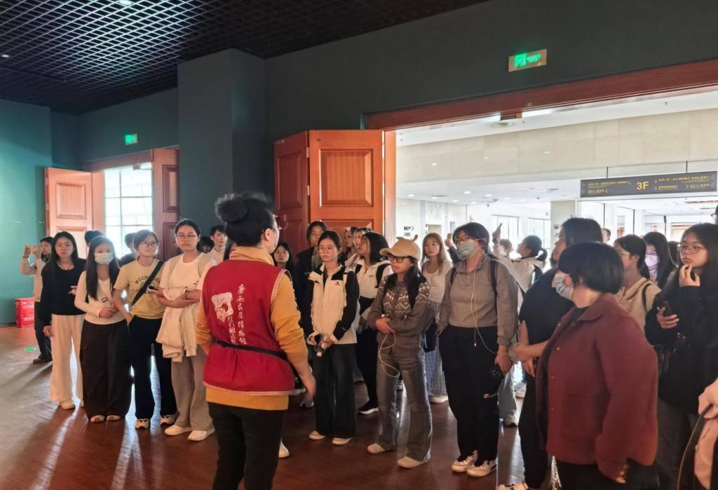 在广西民族博物馆,同学们围绕“地域文化与会展融合”主题开展调研,通过讲解深入了解了广西民族文化特色与非遗资源,探讨了文化元素在会展策划中的转化与应用路径。