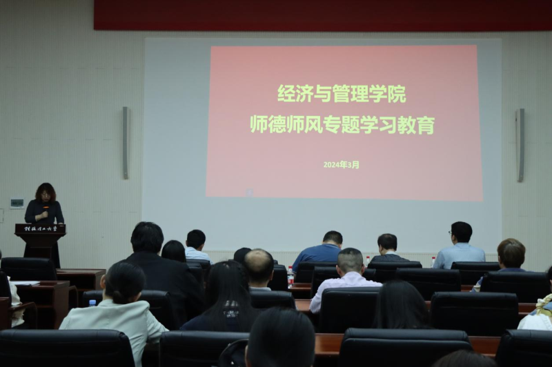 3月29日,经济与管理学院在图书馆报告厅开展师德师风专题学习教育。学院领导班子及全体教职工参加会议,会议由学院党总支书记张凯主持。