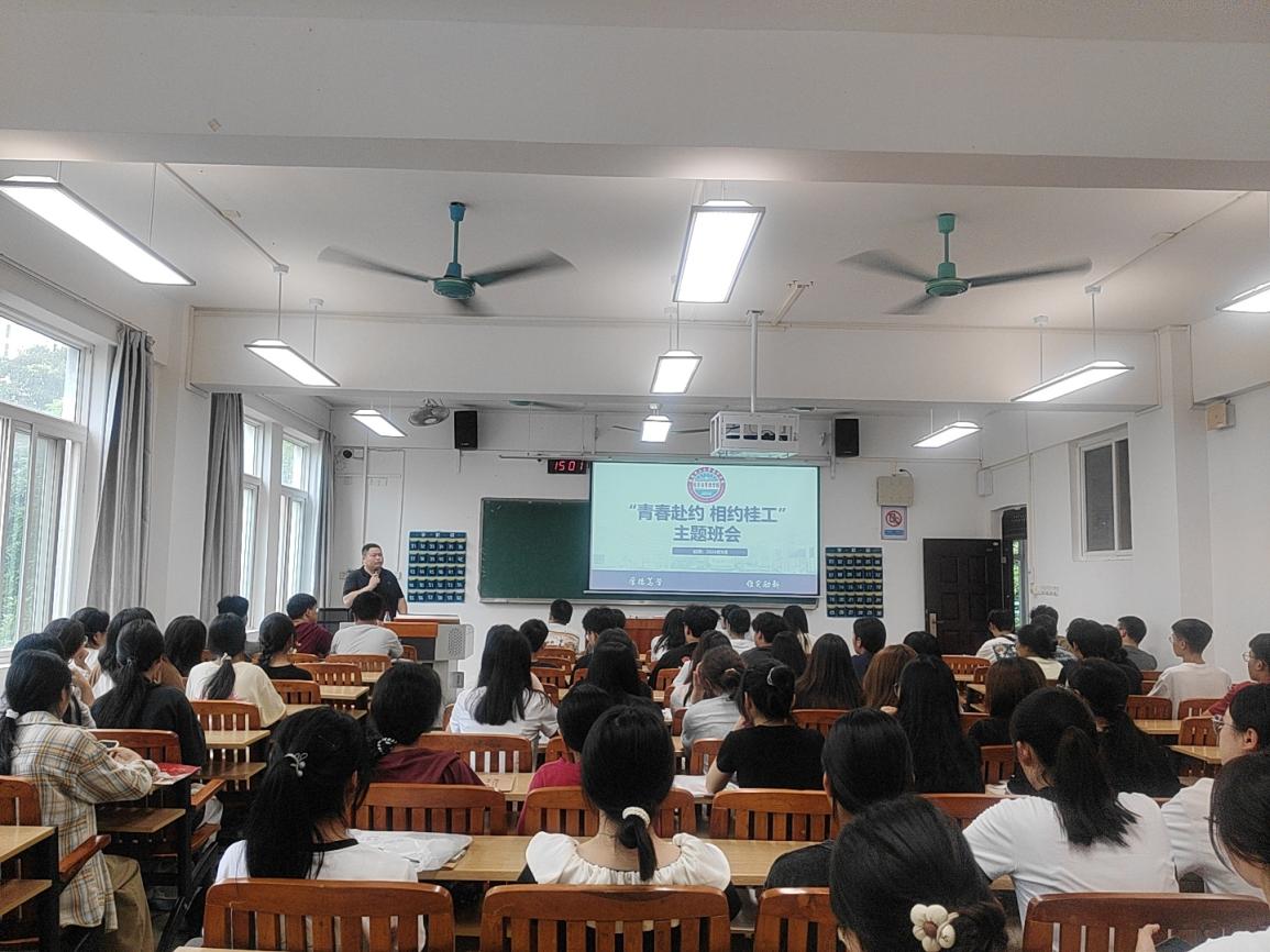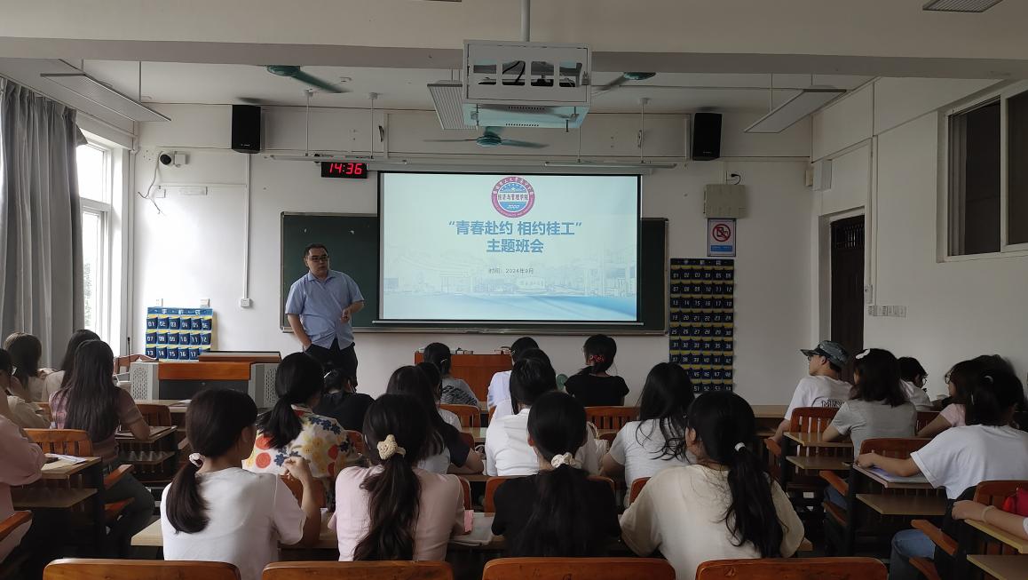 相识相知:“青春赴约、相遇桂工”主题班会。班主任向新生详细介绍了学校历史沿革、办学特色、学院师资力量以及校园环境。为增强班级凝聚力,班会还设置了互动交流环节。新生的发言充满了青春的活力和对未来的无限憧憬,赢得了阵阵掌声。