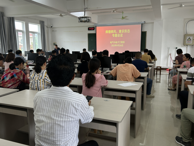 2023年9月26日,电气与电子工程系在玉成楼402教室召开了全体教职工师德师风暨意识形态工作专题会议。会议由系党总支书记甘锦琛主持。