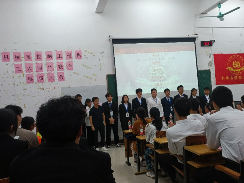 2022年11月10日晚5时40分,机械与控制工程系三大团体联合换届大会在8栋启智楼8103顺利举行。出席本次换届大会的领导与嘉宾有:系党总支副书记兼学工组组长李杰老师、辅导员丁姗姗老师、辅导员蓝慧萍老师、辅导员唐庆老师、辅导员孙一楠老师、辅导员王胜老师。