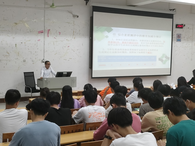 会上,机械系办公室助理中心学风部部长田祖宏先点出了参与活动的对象、内容及时间要求,后介绍了参与活动的具体要求及加分项,最后指出了奖、助学金与综合素质测评中德育和公益活动的关系。随后,丘东林老师在讲话中提出,国家奖助学金是政府民生工程,是资助体系的重要组成部分,是学校工作的重中之重。并强调资助委员工作职能、强化政策文件了解程度、及时配合协调。