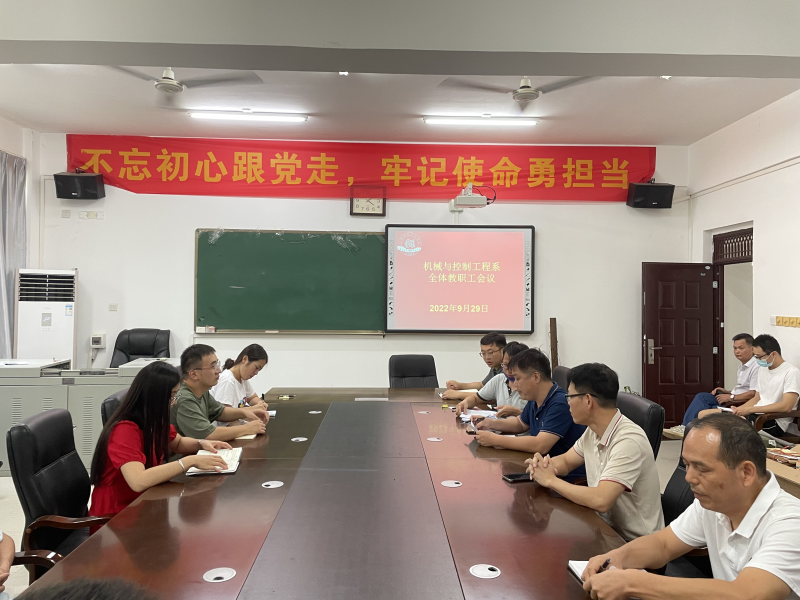 2022年9月26日,我系于3205会议室举行了全体教职工会议。系主任黄荣学、系副主任甘卓权、系党总支书记袁斌、副书记兼学工组组长李杰以及机械与控制工程系全体教职工参加会议。