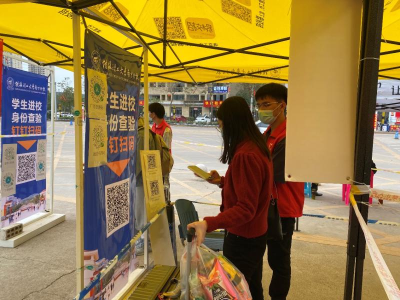 6号早上八点钟,志愿者来到校门口布置场地和分配工作。我系志愿者严格按照“消、审、查、验、测、换”的“六步入校”原则,组织学生完成返校流程:引导入校学生进行卫生消杀、检查钉钉返校审批、检查48小时核酸检测报告、查验”四码“、体温检测、更换新口罩,而后进入校园。