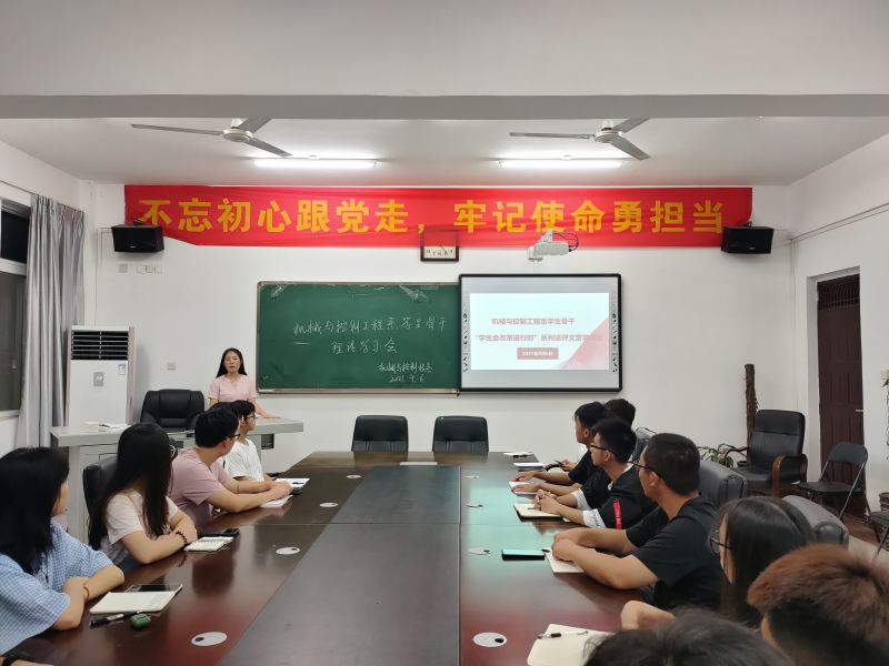 2021年9月6日晚,为深入贯彻落实“学生会改革进行时”精神,持续优化学生会改革,切实发挥学校和同学之间桥梁纽带作用,让学生会组织正真受到大家认可、赢得同学信赖,支持和引导学生会更好地为老师、同学服务,机械与控制工程系团总支·学生会就近期学联学生会工作重点,组织学习“学生会改革进行时”系列述评文章,严格落实学生会工作人员培训制度,扎实开展学生会改革工作。本次会议由辅导员蓝慧萍老师主持,团总支·学生会全体成员参与。