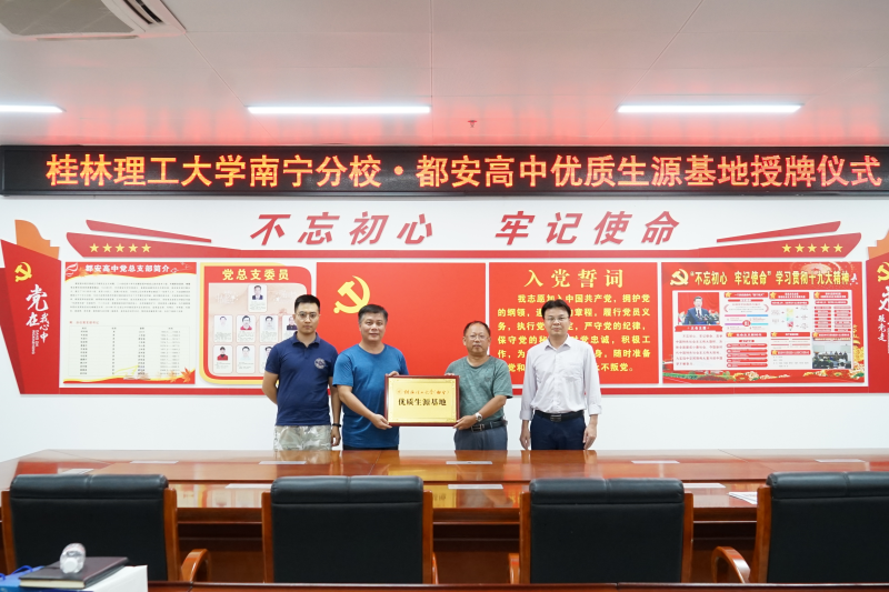6月24日下午,机械与控制工程系党总支书记袁斌、专任教师蒋芳明及学生年度优秀人物黄福耀一行三人代表学校赴都安县都安高中进行座谈交流,并举行 “伟德国际1946(南宁)优质生源基地”授牌仪式。
