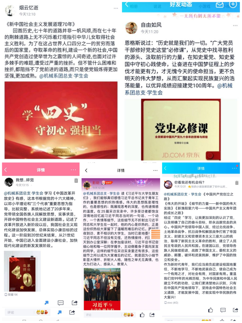 机械青年团员不仅重视自身的学习,也始终不忘自己共产党接班人的身份与职能,努力做好“四史”学习教育的宣传者、参与者、推动者。大家选择自己学习的四史图书利用QQ空间、朋友圈等社交途径宣讲自己的心得。希望我们同学坚定理想信念,牢记习近平总书记的嘱托,成为堪大任的筑梦人,始终保持艰苦奋斗的前进姿态,同亿万人民一道,在实现中华民族伟大复兴的中国梦的新长征路上奋勇搏击。