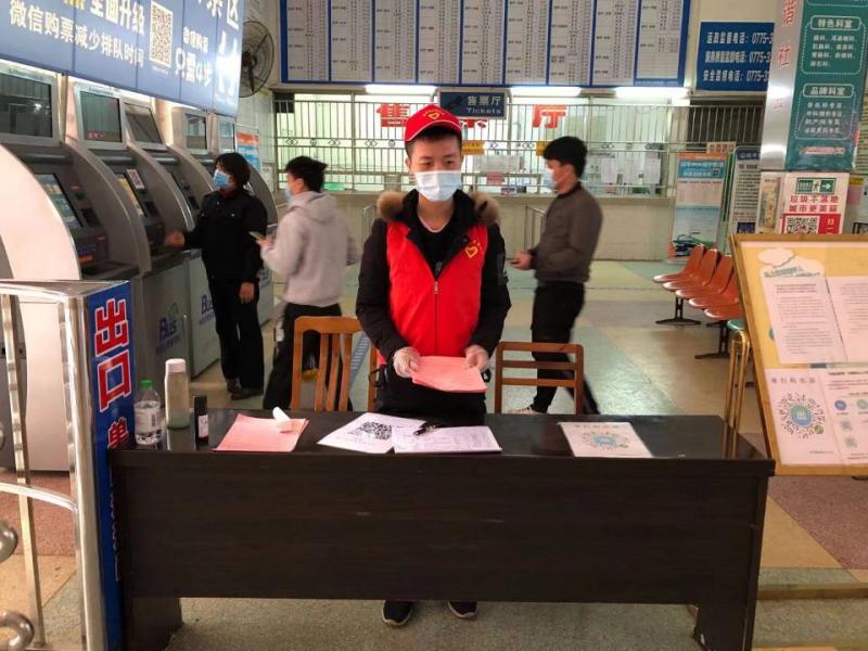 李少强同学正在桂平市火车站发放防疫宣传资料