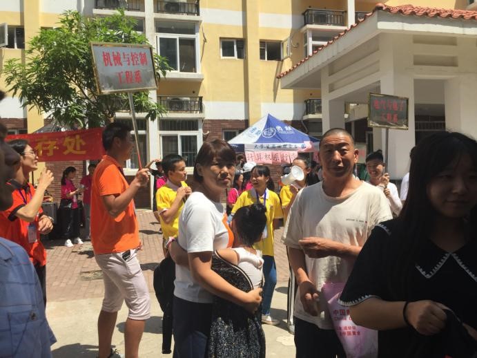 体育馆侧门,有来自火车站接送新生及新生家人的大巴车,各系志愿者会询问下车的新生是哪个系部,并带他们到相应专业班级进行报道。校里校外,随处可见的都是志愿者,他们匆匆忙忙,一个接着一个,来不及喝水,为新生提供自己所能的服务。