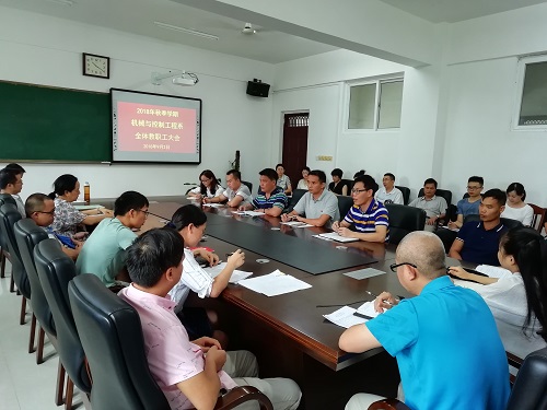 会上,首先我系新进教职工进行了自我介绍,为我系教学团队注入新鲜血液。我系主任黄荣学就新学期教学检查、教学文件归档、实习实训等教学方面工作进行了具体的部署,并要求全体教职工严格按照要求完成各项工作。针对各类教学文件各教研室负责人务必严格把关,发现问题及时反馈、纠正,确保教学文件的规范性。接着,黄主任就上学年专业建设、科研立项、技能大赛、信息化教学大赛等方面进行总结,并对全体教职工新的学年提出了具体的要求,他要求全体教职工务必统一思想,提高教学水平,结合系部专业建设深化产教融合、校企合作,进一步促进应用型人才培养模式改革,致力于培养高素质创新人才和技能人才。随后袁斌书记就我系目前18届毕业生工作推进情况进行汇报,强调就业工作的重要性,同时,对19届毕业生就业工作做了部署,各教研室要继续抓好就业工作,把就业工作落实到实处。另外袁斌书记就18级新生情况进行汇报,并强调迎新工作的重要性,以全新的面貌迎接18级新生的到来。