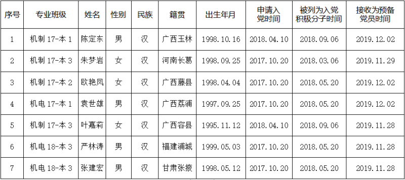 经党组织一年以上的培养教育,袁世雄等7名预备党员预备期满,机械与控制工程系党支部拟在近期召开党员大会讨论他们的转正问题。为了进一步增强发展党员工作的透明度,严格发展党员工作程序,根据《中国共产党发展党员工作细则(试行)》和自治区党委组织部关于印发《关于在发展党员工作中实现入党前公示的暂行规定》的通知(桂组通字〔2000〕91号)文件的有关精神,现将近期拟讨论转正问题的预备党员名单公示如下,公示期5天,自2020年11月23日至2020年11月27日止。对以下7名同志的转正问题,如有异议,请以书面形式并署真实姓名,于2020年11月27日前向机械与控制工程系党总支委员会反映。