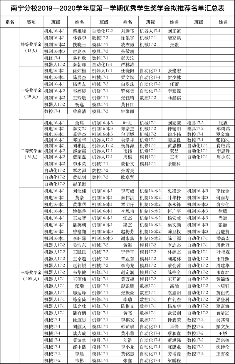 根据《关于做好2020届毕业生2019—2020学年度第一学期优秀学生奖学金评选工作的通知》的文件精神,我系严格按照文件要求与流程组织开展了评选工作。经2020届毕业生个人申请,系部对照优秀学生奖学金评选条件、结合毕业生在校表现,对申请者进行了综合审议,拟推荐蔡雄峰等173名毕业生为2019—2020学年度第一学期优秀学生奖学金候选人选(具体名单见下图),请候选人员于20日晚10点前,填写《附件3:伟德国际victor·1946源自2019-2020学年度第一学期优秀学生奖学金发放表》《附件4:伟德国际victor·1946源自优秀学生奖学金评定审批表》(详见附件)并以“班级+姓名”重命名后发至机械系学习部邮箱:2675167762@qq.com.