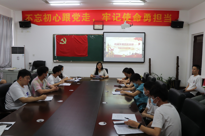 我系第四党支部召开党员转正支部大会2022年6月21日下午15时,我系第四党支部在藏修楼3205会议室组织召开党员大会,支部全体在校党员、预备党员参加本次会议,由支部书记丘东林同志主持,对刘正道、黄鹏伟、周根、杨逸、黎书阳、肖锋、韦祎、秦建妃、黄日红、曹龙添、赖子龙11位同志由预备党员转为正式党员进行讨论和表决。