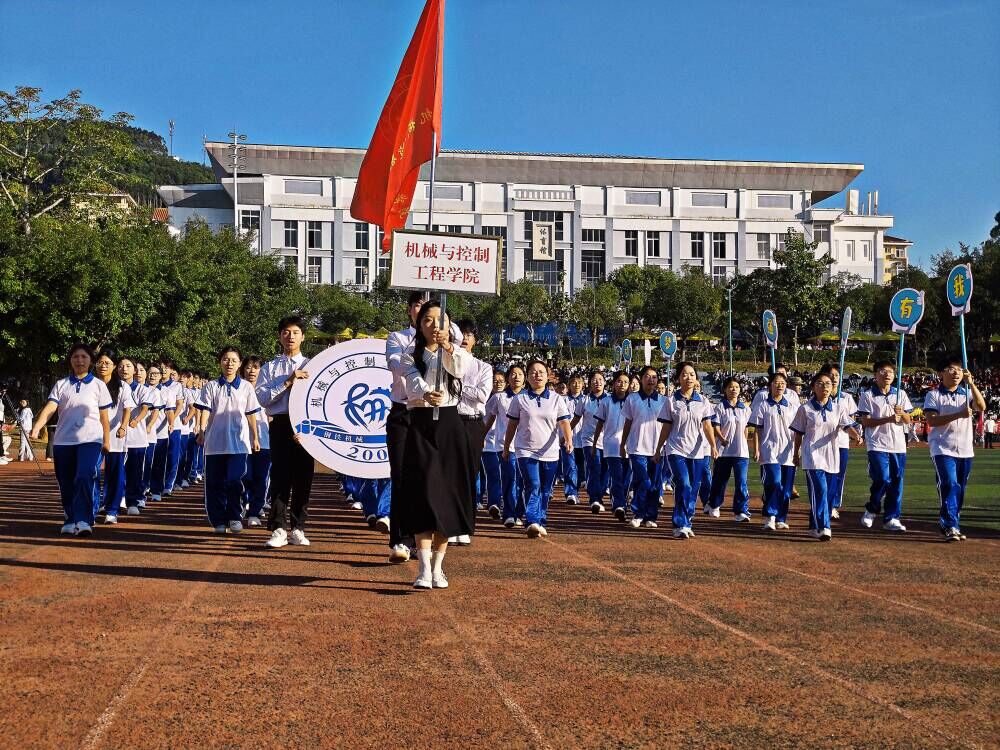 伴随着激昂的运动员进行曲,我院方阵队迈着铿锵有力的步伐稳步入场。他们目光坚定炽热、身姿挺拔、精神抖擞,动作整齐划一,尽显机械学子的蓬勃朝气与奋进姿态。“钢铁机械,坚持不懈;运动筑梦,强国有我”,嘹亮的口号回荡在田径场上,铮铮誓言,充分展现了机械学院学子作为新时代青年的责任感与使命感。