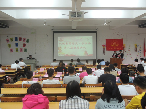 接下来,由我系党总支副书记兼学工组长甘锦琛老师为我们宣读第八届委员任职情况。老一届委员为新一届委员进行挂牌,将手中的责任与担当传递给新一届委员。唐淑珍、何建金、韦选建、张业娟老师们分别为老一届委员们颁发了聘书,肯定他们一年来的辛勤工作。随后,老一届主席王栎霖同学代表发言。简要的讲解了在学生会工作的情况,及学生会不足进行了工作总结。新一届学生副书记杨安威同学代表发言,表示要尽心尽责,勇于担当责任,做好系部各项工作。