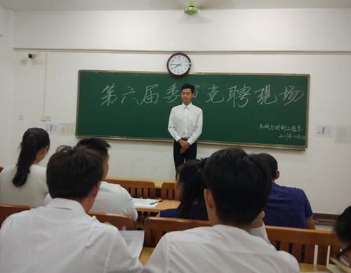 本月13日晚,我系于藏修搂204课室为竞选我系学生会主席团、各部门部长的竞选者搭建了一个舞台,让他们在这里展示自己的才华,展示自己的领导和管理能力,开展了新一轮学生会换届前的竞聘选拔活动。出席此次竞聘会的嘉宾有:我系辅导员何建金老师、张叶娟老师、李肖然老师、韦选建老师以及我系团总支学生会各个部门成员。