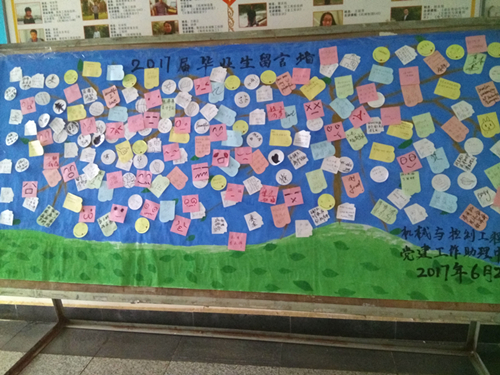在那一张小小的纸上有着17届学子们道不尽的离别情、诉不完的留恋意,情意难忘:祝福母校,难忘青春!在这里我们也真诚的祝福17届的学长学姐在外一帆风顺!