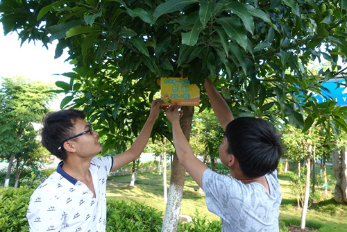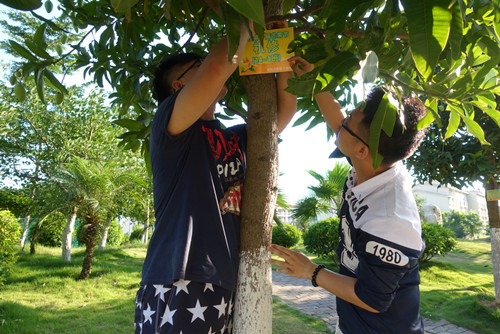 本次活动中,我系14、15级共21个班级对21棵芒果树进行了认养。当各班班长欣然从老师手中接过订制的班牌后,通过合作的方式将班牌挂在了选定的芒果树上,喜悦之情洋溢在每一个参加活动的学生脸上。活动现场,班长们还向过往的班级同学自豪地介绍本班级分配到的芒果树,邀请大家一起做好接下来果树的养护工作。