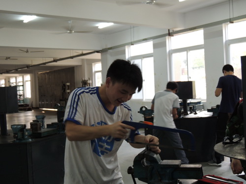 当时间走到了17点的时候,比赛准时开始。比赛的40多位同学手拿锉刀钢锯来回的锯着工件,炎热的夏天同学们汗流浃背可是没一位同学因为天热而放弃。钢锯锉刀与工件发出的声音成为了车间的交响曲,成为比赛的动力。量具在工具上量了又量生怕出一点点差错,这是一场细节的比赛,荣誉就可能因那一毫米之差而擦肩而过。