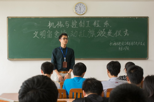 仪式开始由生活部干事黄子健同学对此次的文明宿舍评比中的工作和发现的问题等方面进行总结。本次活动共评比出了6个“文明宿舍”,张老师与王老师一起为获得“文明宿舍”称号的3B112、3B323等6个宿舍颁发流动红旗。