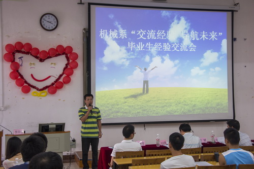 2014年6月26日下午,机械与控制工程系于空港校区启智楼101教室开展 “交流经验,导航未来”毕业生经验交流会。该系党总支书记袁斌老师、副主任刘高鹏、学工负责人刘术刚老师、辅导员张斯亮老师以及机械系全体学生均出席了本次活动。