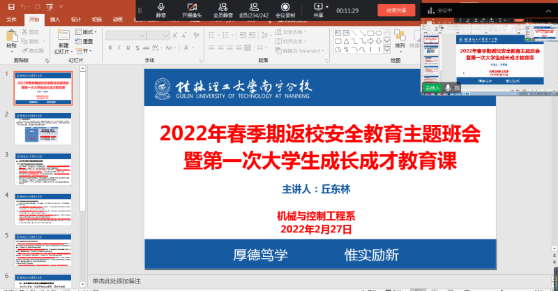 2022年2月27日晚上8:00,我系智造专业19、21级召开召开线上春季期返校安全教育主题班会暨第一次大学生成长成才教育课,我系智造专业19、21级班级全体学生参加活动。此次会议由辅导员丘东林老师主持。