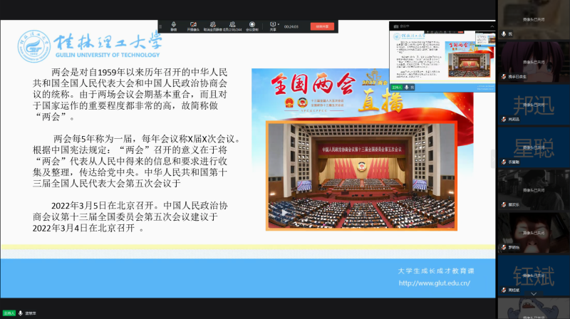 为了更好的深入贯彻习近平总书记关于“大思政课”建设的重要指示精神,全面落实全区教育工作会议和全区教育系统疫情防控工作视频会议精神,确保2022年春季学期“开学第一课”取得扎实成效,系部在大学生成长成才教育课程内容中增设了学习两会的内容,春季预防疾病安全、疫情防控教育等主题,面向全体学生开展“开学第一课”专题思政课,同时针对两会组织党员和学生骨干开展了两场网络热议活动,成效显著。