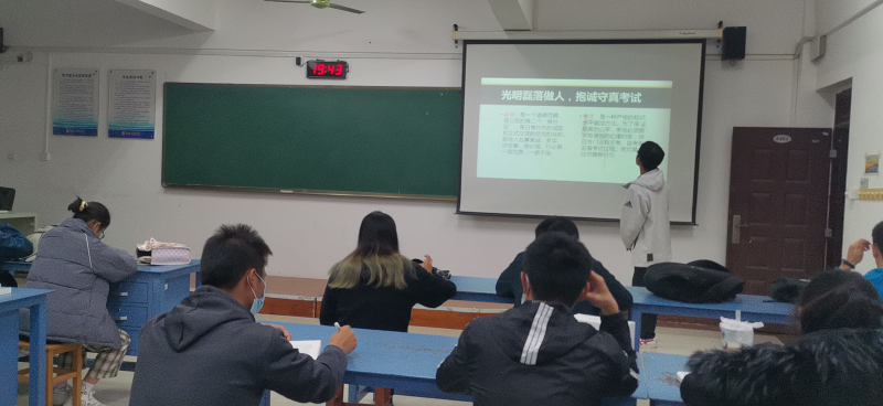 我们的学习之路,必有考试相伴。班会开始,学委首先提出问题“我们为什么要考试”“什么是诚信考试”,继而让我们认识到无论是校内课程的考试还是英语四六级、各类证书、全国计算机考试我们都要做到最基本的诚信考试,考试是严格的知识水平鉴定方法,诚信是道德范畴,是公民的第二个“身份证”。随后,学习委给我们分析考试作弊的原因并列举出一些诚信缺失的现象。接下来,介绍考试作弊的不良影响,考试作弊会败坏学校学习风气,破坏公平竞争的原则,考试作弊还是违法行为,还将受到学习手册中作弊规定的处分。并通过一则真实的考试作弊被通报处分的案例说明了考试作弊的危害。最后,我班同学都在诚信考试承诺书上签字,确认自己将认真遵守考试秩序,诚信考试。