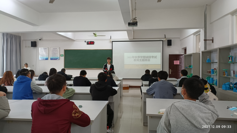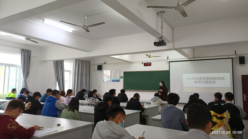 期末考试周慢慢靠近,同学们已经进入了紧张的期末复习阶段,为了增强同学们期末考试诚信意识,提高自主应试能力,我系智造21-本2班于2021年12月9日星期四早上9点半在藏修楼3402开展“诚信考试教育”主题班会,本次班会由班长杨文熙主持展开,辅导员丘东林老师参与本次教育课的重要讲话。