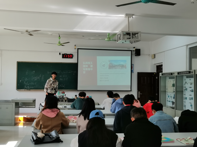 为进一步发挥基层团组织和广大青年学生的积极性、主动性和创造性,围绕学校发展历程、桂工精神渊源、先进事迹典型等进行学习教育,带领广大青年学生了解桂工校史,熟悉校风校纪,增强同学们作为桂工学子的自豪感和使命感。11月26日早上12点,我班在3303教室开展了以“弘扬桂工精神,谱写青春华章”的主题团课,本次团课由团支书冯佳琦同学主持,参与的人员有数控20-1班的全体同学。