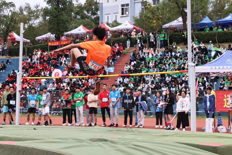 2021年11月12日上午,秋高气爽,在阳光照耀下的田径场上,跳高的比赛现场格外耀眼。