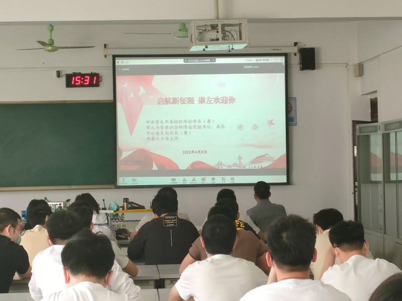 4月8日下午15:30,机械系在藏修楼3303、3304组织设置崇左市“领导干部进高校”暨“留人计划”政策宣讲报告会——机械系分会场,并有序组织在校毕业生参会。会议由中共崇左市委组织部副部长(兼),市人力资源和社会保障局党组书记、局长,市公务员局局长(兼),市委人才办主任谢添主持。
