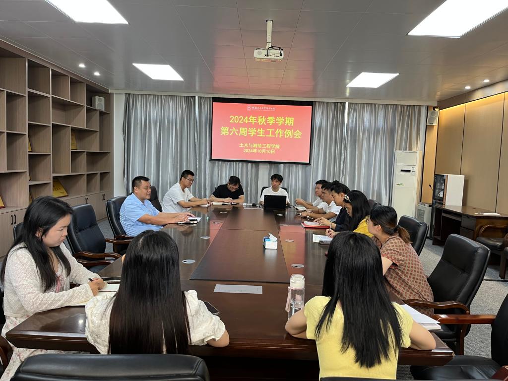10月10日上午,土木与测绘工程学院2024年秋季学期第六周学生工作例会在物华楼406会议室召开。会议由学院党委副书记兼学工组长何建金主持,全体辅导员参加本次会议。