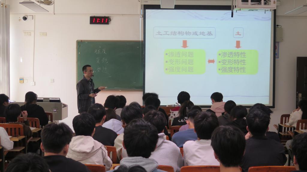 课上,蒙高磊老师以典型岩土工程实例为切入点,将理论知识与工程实际深度融合。教学过程中,他巧妙嵌入课程思政元素,通过解读重大工程建设中岩土工程师的责任担当,引导学生树立 “严谨务实、精益求精”的工程素养,实现知识传授与价值引领的同频共振。整堂课逻辑清晰、互动积极,充分展现了其扎实的专业功底和良好的教学能力,获得了观摩教师的一致认可。