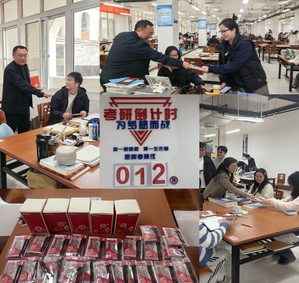 12月9日下午,图书馆馆长谢晓明、副馆长唐小芳一行来到二楼自习室考研专区,开展考研学子慰问活动,为奋战在备考一线的同学们送上关怀与鼓励。