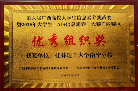 本次大赛由广西本科高校图书情报工作指导委员会等单位主办,旨在提升大学生在人工智能时代的信息素养与创新能力。图书馆高度重视此次比赛,前期通过积极宣传和精心筹备,共组织547名在校学生踊跃报名,经过激烈的校级选拔,我校共有9支优秀队伍成功晋级区赛。最终,我校在决赛中,选手们凭借着出色的发挥和赛事组织工作,荣获大赛“优秀组织奖”。据悉,全区高职高专院校中仅有8所获此殊荣,这标志着我校在信息素养教育与实践组织方面的工作得到了赛事组委会的高度认可。