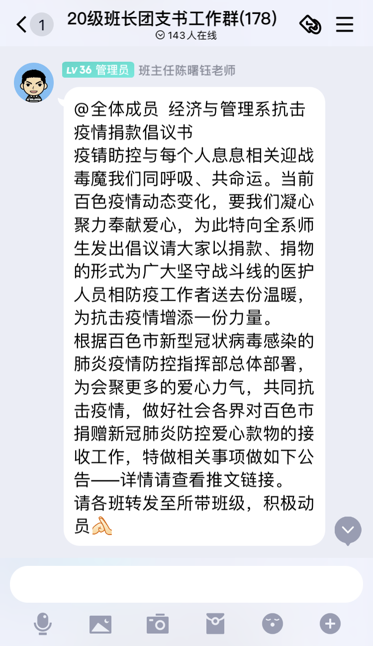 (经济与管理系在20级班长、团支书工作群发布募捐消息)