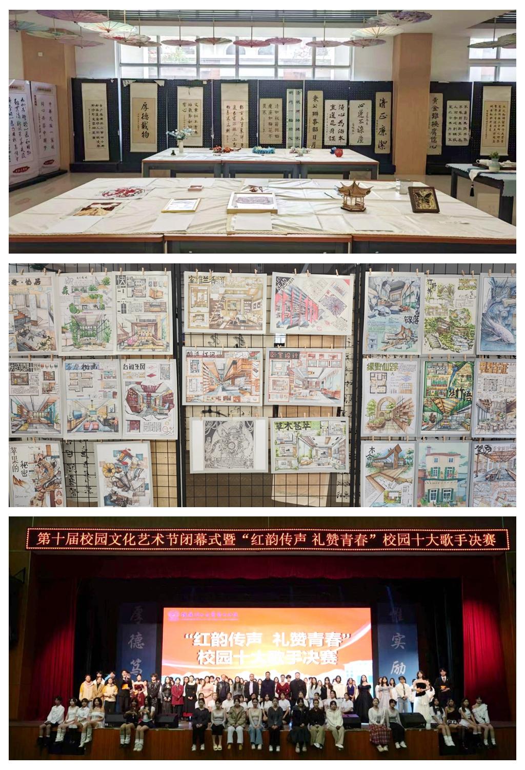 艺术节期间,缠花、辑珠等非遗技法融入手工艺品创作,传统云纹与国风配色尽显古韵;书画篆刻赛场内,学子们挥毫泼墨、精雕细琢,笔墨间饱含炽热家国情怀;摄影大赛以镜头为笔,定格校园里的奋进身影与温暖瞬间,生动勾勒青春的昂扬风貌;民族服装秀以环保材料再造民族风情;情景剧大赛以舞台为载体,用真挚演技传递青年的使命担当,引发师生强烈共鸣;十大歌手决赛将艺术节氛围推向高潮,体育馆内歌声与掌声交织回荡,尽显学子的创新活力与文化自信,为校园生活绘就了浓墨重彩的一笔。