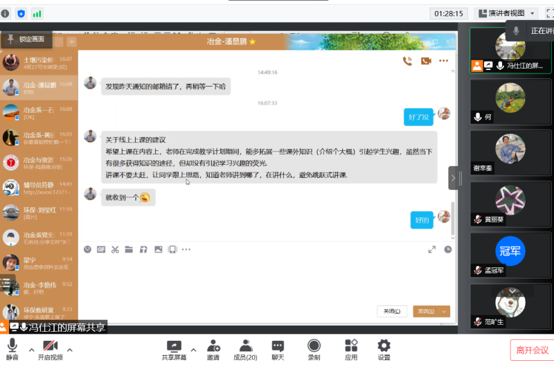活动中,支部书记何贵香首先指出我校实行线上教学已满六周,开展此次活动目的在于加强教学经验交流,探索和完善防疫期间线上线下同步授课,不断提升教学质量。接着党员教师就线上开课以来在上课模式、作业形式、直播平台使用和调动学生听课积极性等方面总结的经验进行了交流分享。同时,党员教师根据目前学生们提出的问题进行了讨论分析,对如何提升线上教学质量提出了改进措施。