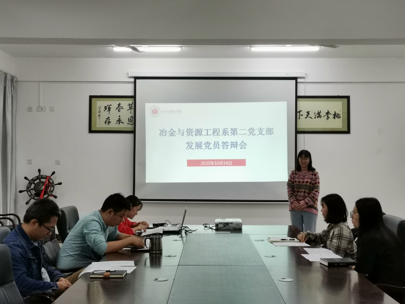 10月14日下午,冶金与资源工程系第二党支部在探源楼207会议室召开党员发展答辩会。本次会议由第二党支部书记方艳主持,会议对吴文郁等11位发展对象是否接收为预备党员进行讨论,党支部全体支委参加了会议。