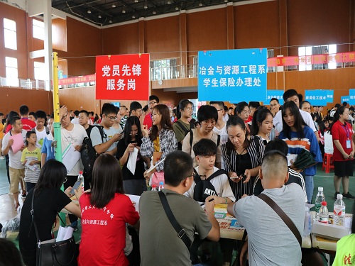 9月8日,在忙碌而有序的迎新现场,一群身穿红色系服,胸前佩戴着“党徽”的志愿者,他们是冶金与资源工程系的学生党员。在迎新工作中,学生党员志愿者们尽心尽力为新同学们提供了细心、周到、温馨的帮助。