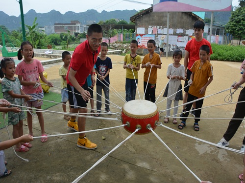 接着,在球场进行的素质拓展活动中,志愿者们为小朋友们精心准备了时光穿梭、袋鼠跳、击鼓传球、神笔马良、抛绣球等趣味游戏。
