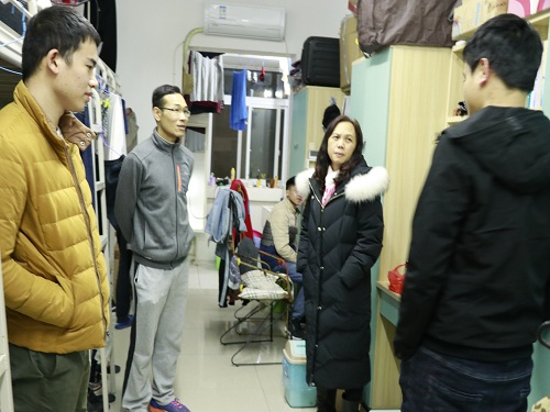 党总支书记石有总(左二)与系主任何贵香(右二)走访宿舍